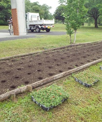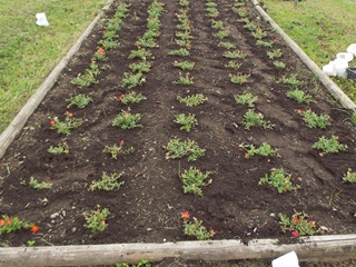 花苗はすでに各場所に配られていて、土も整備され植える場所に穴が掘ってあり、担当場所が早く終了したところは残っているところを手伝い皆で協力しあってポーチュラカ2,800鉢の新しい花にすべてが植え替えられました。45分程度で終了後、42名の参加者全員に2鉢の花苗のプレゼントがありました。