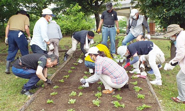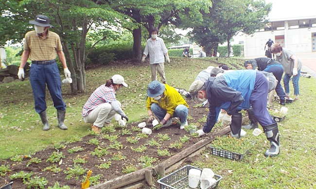 近藤会長の挨拶、スポーツ文化公園の吉澤課長の花苗の植え方の説明があり、担当場所の花苗の植え付け作業をしました。