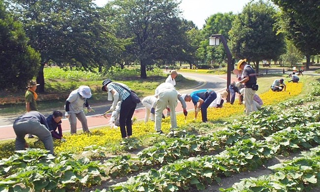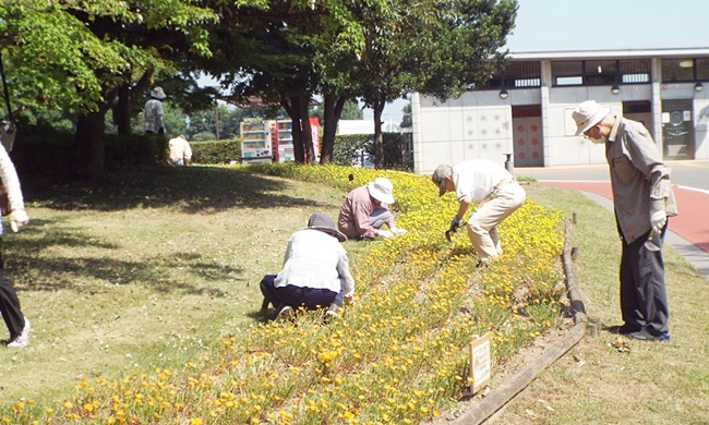 四阿前の他団体が管理する花壇の一部が、雑草が伸び放題で草花がすっかり埋もれて見えなくなっておりました。スポーツ文化公園の吉澤課長の依頼により今日の花ボラ開始前に早く来た人達で、この花壇の除草作業を行い、草花が見える様になりました。