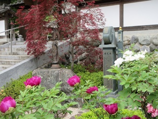 (摩尼寺と観音像) (境内に咲くボタンの花)