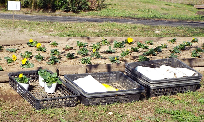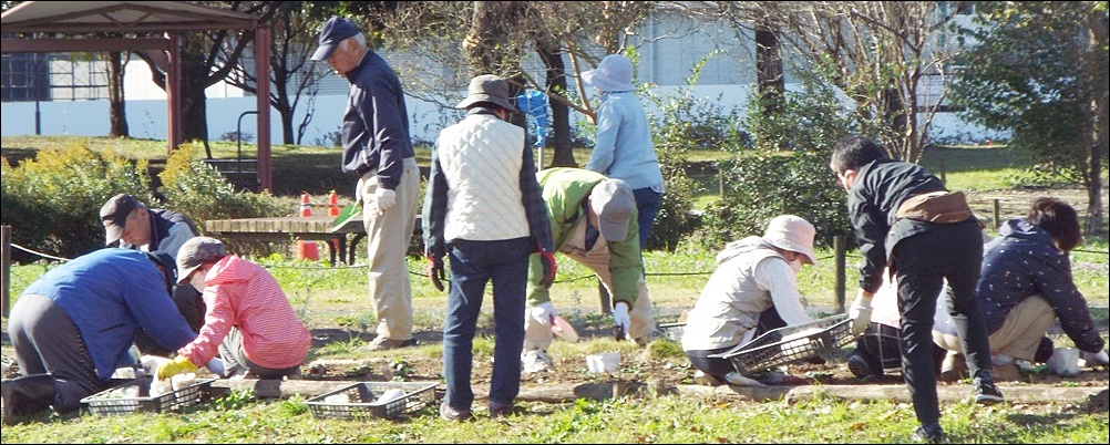 パンジー4色(赤、白、黄色、オレンジ)を参加者44名で植付け作業を実施しました。既に公園側で植え穴が掘ってあり、2500株を効率よく40分で終えました。最後に2株のパンジーのプレゼントがあり散会しました。