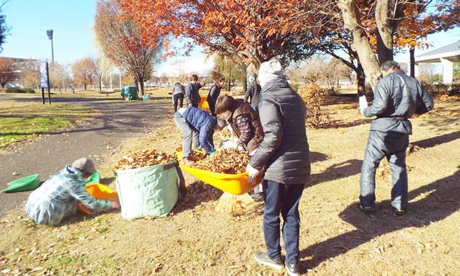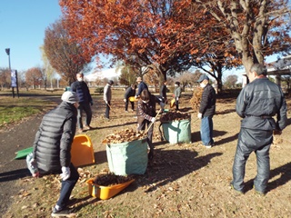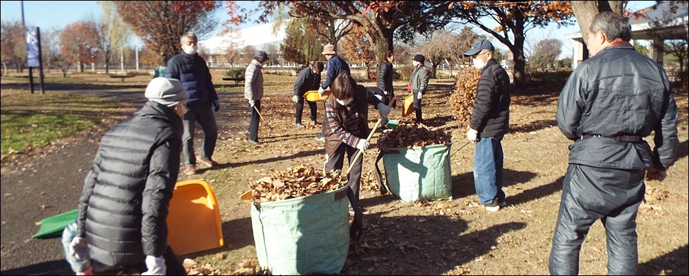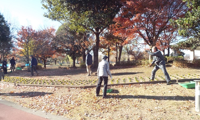 二十四節気の「大雪」が今月7日でした。晴天ですが、朝の冷え込みが厳しい中で花ボラが行われました。作業内容は、枯れ葉の清掃です。すっかり葉を落とした欅や桜などの木の下で、参加者25名が協力し手際よく30分程度できれいに片づけられ、11月12日に植付けたビオラは元気に育っています。
