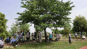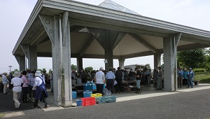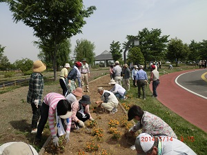 5月14日、2班は、8人が熊谷スポーツ文化公園での花壇ボランティアに参加しました。 今日は暑くなるとの天気予報。 なので皆さん、ペットボトルや水筒を持参していました。 熊連協の会長のあいさつがあって、さあ、作業開始です。 |