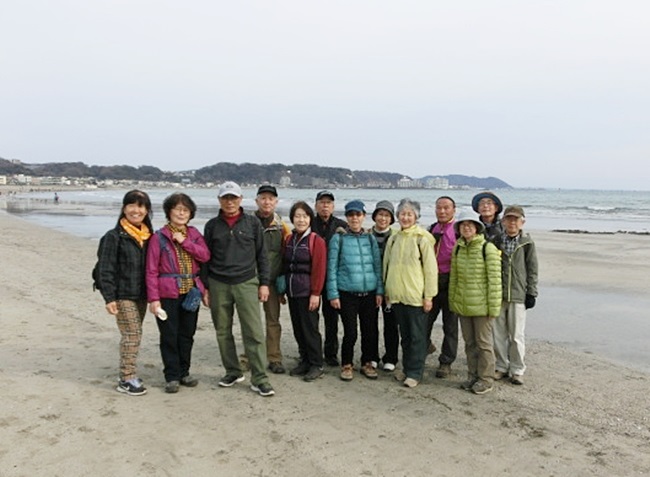 昼食は、空いている店を探し、3月11日解禁の「しらす丼」を食べ満足な昼食でした。食後は鎌倉に来ても海岸を見ていない人も多く、由比ガ浜海岸で海の匂いを胸いっぱい吸い込み、気持ちの良い浜歩きを楽しみました。駅への途中で「コーヒータイム」も。鎌倉駅には16時到着、約17,800歩の早春ハイキングでした。