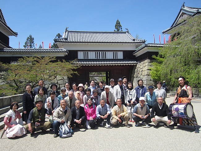 上田城の桜はすでに散り始めていましたが、遅咲きの桜や野草の花に信州の春を感じられ心地の良い見学でした。見学のあと大手門で記念写真撮影です、武士の衣装を着たボランテアの人たちと記念写真でした。