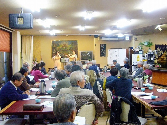 毎年年齢層に相応しい「勉強会」を講師を招いて実施してきましたが今回は趣向を変えて皆で楽しめる会を行おうという趣旨で若くて可愛い2人の音楽家を招いて「音楽鑑賞会」を実施しました。
