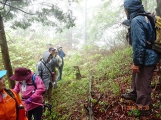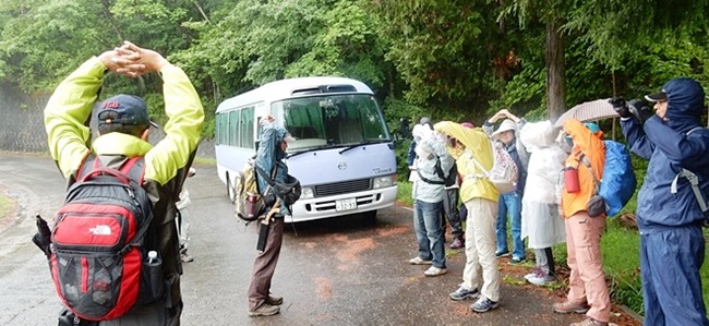 今回のコースは桧沢峠から日陰山(1409ḿ)へ、それから尾根伝いを歩いて降りてくるというものでした。マイクロバスで登山口まで送って頂き、雨模様の装備に着替え、先ずは準備運動から体を慣らし出発しました。