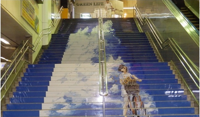 勢いよく沸き立つ白い雲を背景に、自転車にまたがった少女がイラストタッチで描かれています。階段を上がる方向に雲の沸き立つ向きが合致しているため、まるで3次元アートのような視覚的な躍動感をもたらしています。