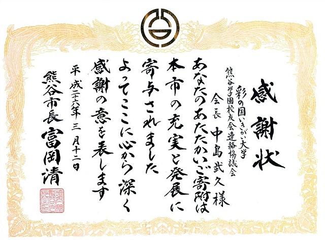 熊連協のボランティア活動に対し、財団法人埼玉県公園緑地協会理事長より感謝状を受ける。