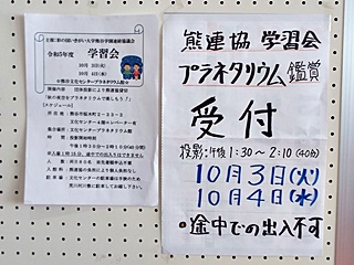9月29日の中秋の名月(満月)が過ぎて、長かった残暑が終わりようやく涼しくなってきました。今年度の学習会は、熊谷市立文化センタープラネタリム館を熊連協の団体投影として貸切り「秋の夜空をプラネタリウムで楽しもう!」の下、10月3日(火)、4日(水)の午後1時30分~2時10分(40分間)投影され鑑賞しました。入館料(100円)は熊連協予算から負担させて頂きました。