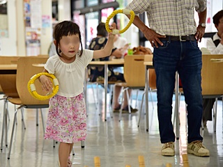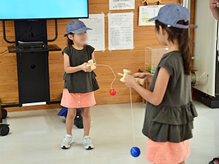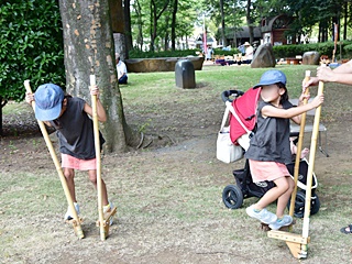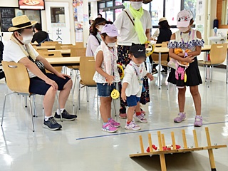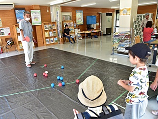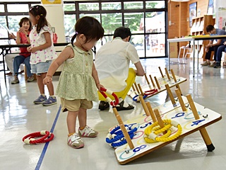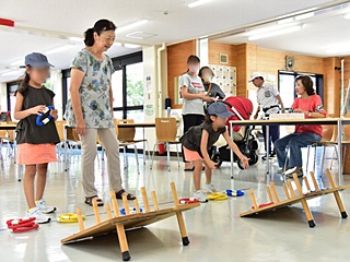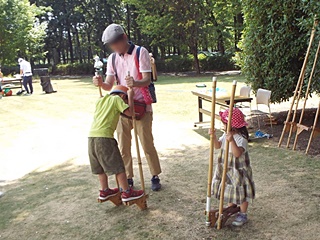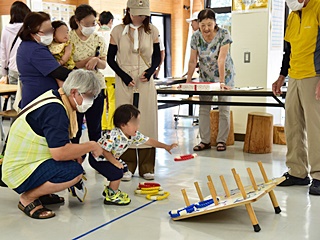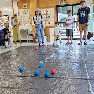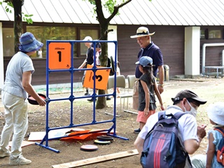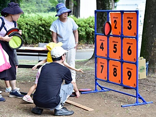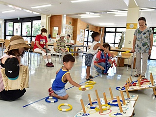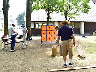 今回用意した昔遊びは、輪なげ・竹馬・水鉄砲・けん玉・お手玉・フラフープ・スイカ割りを用意しました。昔から親しまれている遊びは、遊び方やル-ルが極めてシンプルです。お父さんもお母さんも最初は遠くから見ているだけでしたが一声かけると、子供と一緒に真剣な眼差しで楽しんおりました。また新しい遊 びとしてボッチャとストラックアウトを用意し大変好評をいただきました。