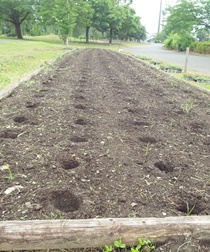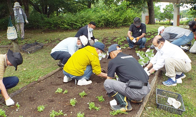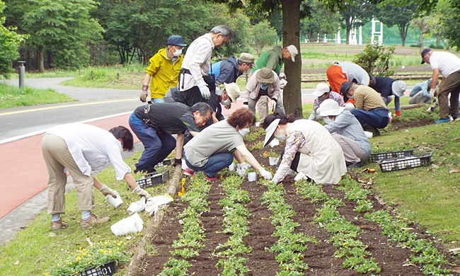 近藤会長の挨拶、スポーツ文化公園の吉澤課長の花苗の植え方の説明があり、担当場所の花苗の植え付け作業をしました。