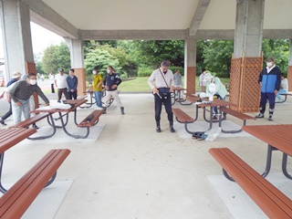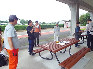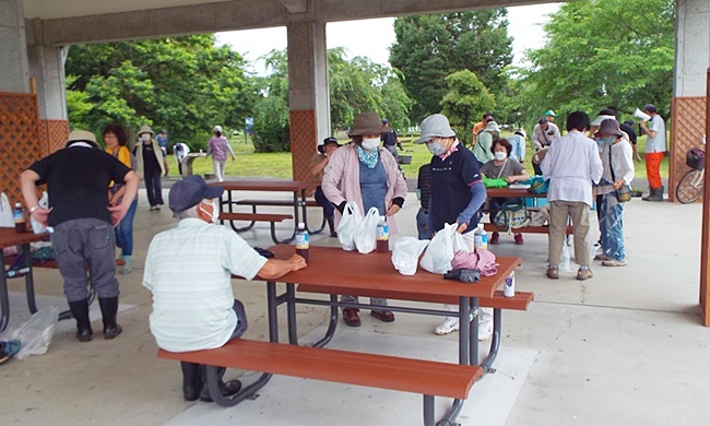 梅雨に入り、熊谷近辺は朝から雨が降っており、花ボラの実施が危ぶまれましたが、会場のスポーツ文化公園花壇周辺の天気は、ちらほら雨模様でしたがどうにかもち作業をすることができました。