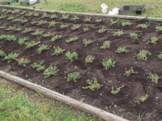 花苗はすでに各場所に配られていて、土も整備され植える場所に穴が掘ってあり、担当場所が早く終了したところは残っているところを手伝い皆で協力しあってポーチュラカ2,800鉢の新しい花にすべてが植え替えられました。45分程度で終了後、42名の参加者全員に2鉢の花苗のプレゼントがありました。