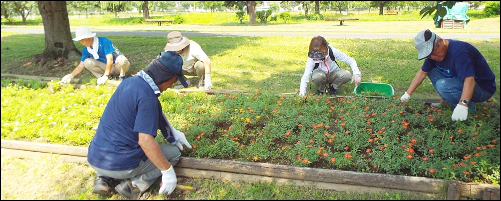最初に近藤会長の挨拶、石川文化祭実行委員長より文化祭について、西田副会長より農林公園夏祭りについて、及びスポーツ文化公園の吉澤課長の作業内容の説明に続き、ラジオ体操、その後担当の花壇に移動して除草作業を開始。日当たりの良い場所は雑草が伸び放題で草花は埋もれておりました。抜いた草木は一山に積んでおけば管理事務所で整理して頂けます。