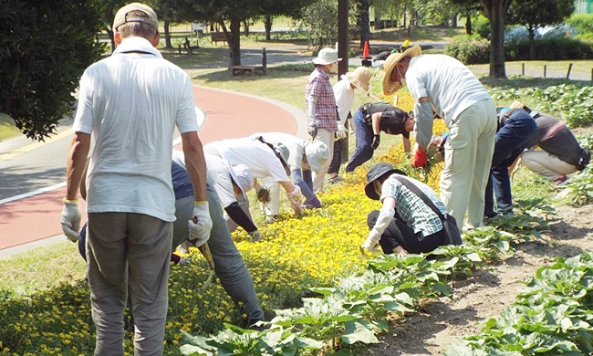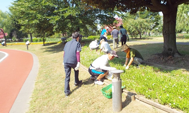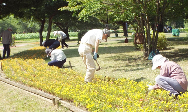 四阿前の他団体が管理する花壇の一部が、雑草が伸び放題で草花がすっかり埋もれて見えなくなっておりました。スポーツ文化公園の吉澤課長の依頼により今日の花ボラ開始前に早く来た人達で、この花壇の除草作業を行い、草花が見える様になりました。