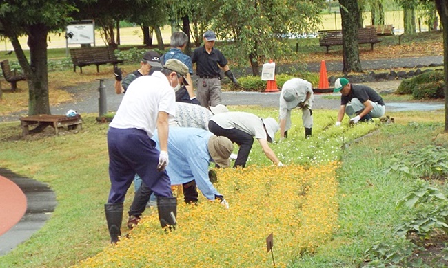 台風6号の影響で昨晩から雨が降っており、花ボラの実施が危ぶまれましたが、定刻の9時には会場のスポーツ文化公園花壇周辺は幸いにも雨が上がり花ボラ実施できました。今回は雨の中33名の皆さんが集まって頂きました。