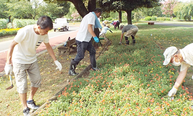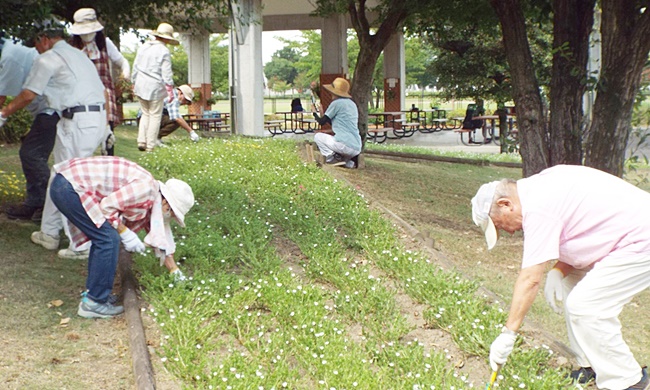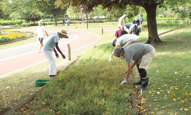 今日は暦の上では立秋でしたが、朝の曇り空から9時頃には真夏の日差しとなり、いつもの暑さになりました。6月12日に植えた「ポーチュラカ」は暑さと乾燥に強い花らしく負けずに元気に咲いていました。花壇内の雑草取り(暑さのため少ない)に汗を流した後、公園事務所から提供された冷えた飲み物で喉を潤し情報交換後に散会しました。