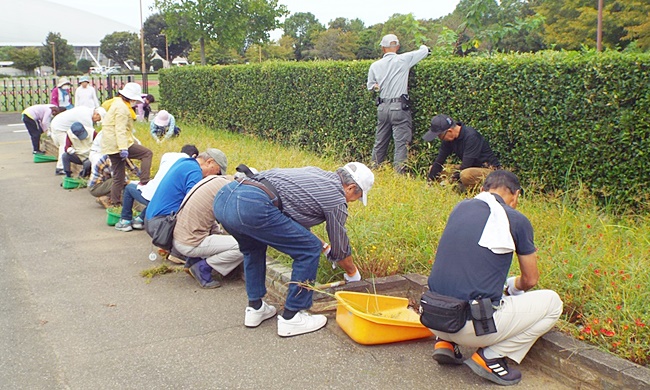 秋分の日も過ぎて暑さ寒さも彼岸までの通り、今朝はヒンヤリ肌寒く感じられました。今回は熊連協の花壇には草が少ないので、休憩所のすぐ北側にあるランバイクBEARの花壇に雑草が繁茂しているため、この花壇の除草を33名の参加者全員で実施しました。わずか30分程度で見違えるようになりました。 ひさしぶりに本格的な除草作業に心地よい汗を流しました。また、公園側から飲み物が用意されました。