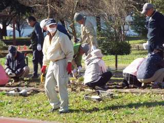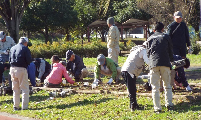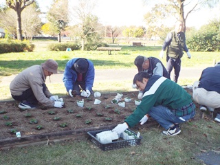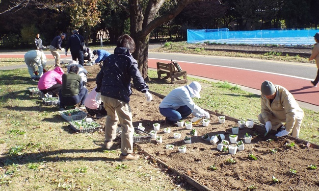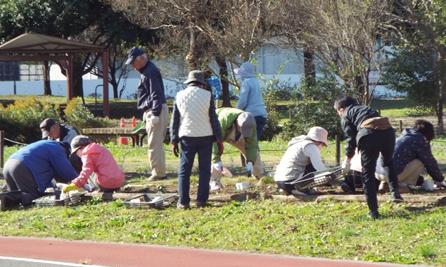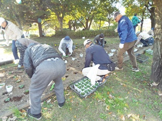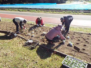 パンジー4色(赤、白、黄色、オレンジ)を参加者44名で植付け作業を実施しました。既に公園側で植え穴が掘ってあり、2500株を効率よく40分で終えました。最後に2株のパンジーのプレゼントがあり散会しました。