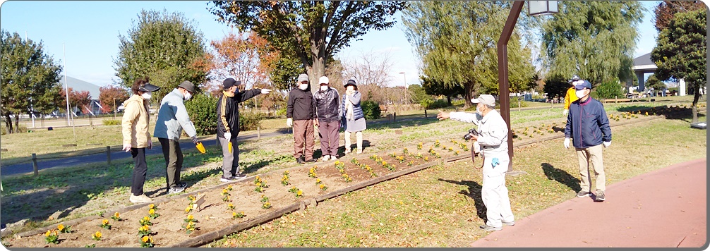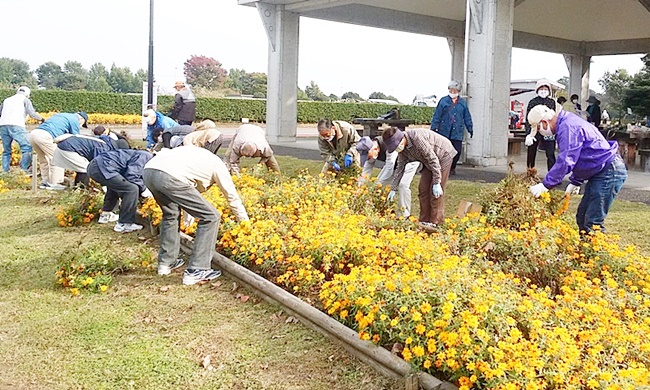 社会参加活動として、最初に挙げられるのは熊谷スポーツ文化公園花壇管理ボランティア(花ボラ)です。毎月2回第2・第4水曜日、早朝1時間実施しています。