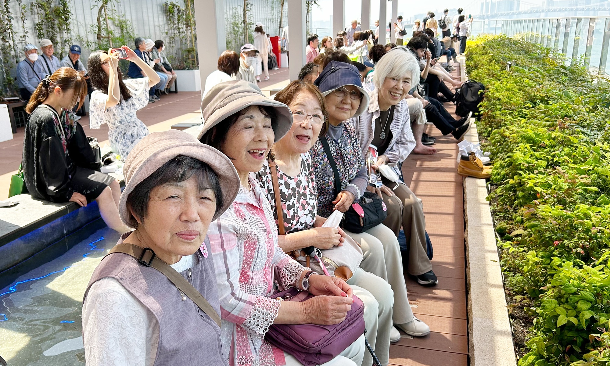 (👆クリックで拡大 足湯で童心に帰る乙女たち と、元気なシルバーおじさん達)