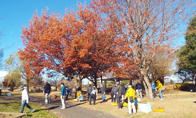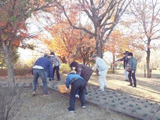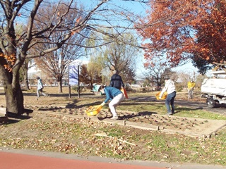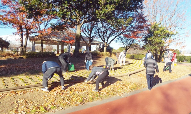 二十四節気の「大雪」が今月7日でした。晴天ですが、朝の冷え込みが厳しい中で花ボラが行われました。作業内容は、枯れ葉の清掃です。すっかり葉を落とした欅や桜などの木の下で、参加者25名が協力し手際よく30分程度できれいに片づけられ、11月12日に植付けたビオラは元気に育っています。